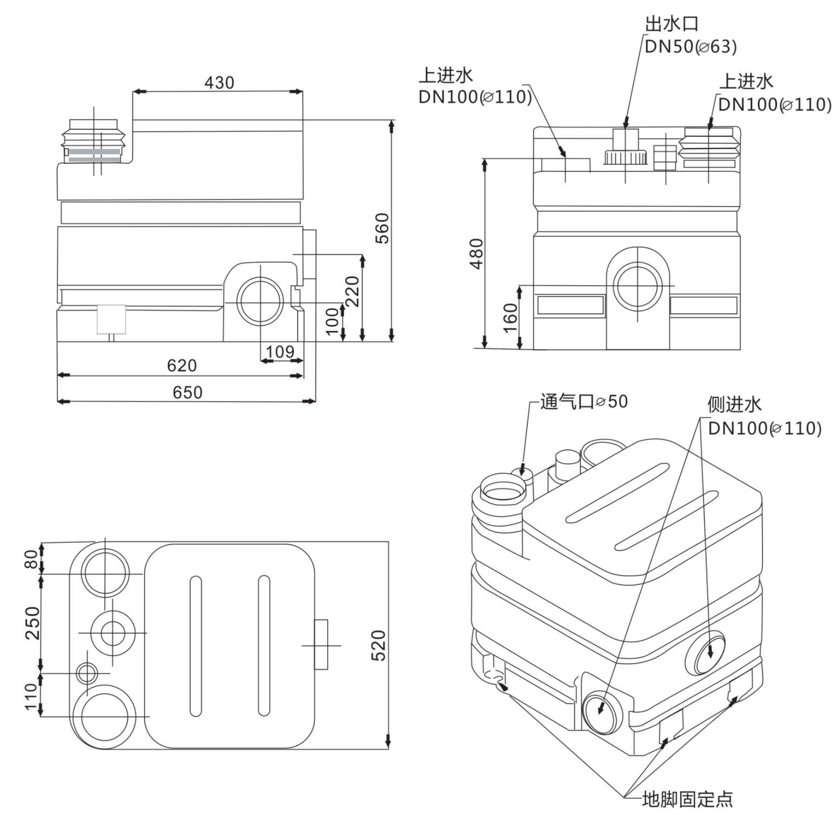 耐腐蚀性PE箱体,完全密闭,无异味散发,经久耐用,可在狭小的空间内安装使用。水泵耦合连接、维修便捷,多个进水口,安装方便,内置不锈钢止回阀。内置切割型潜污泵,适用多种复杂环境。控制器特点:水泵空载保护、可设置延时启动/停止,水泵过载保护、高抗干扰性能,高位报警强启、手动/自动切换、自动巡检等功能。