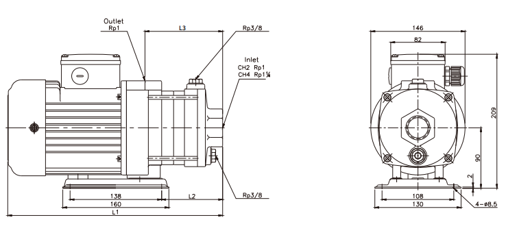 CH为水平多段式离心泵浦,非自吸,泵与马达同轴设计,配用机械轴封,叶轮安装在马达延长之轴心上,轴向入口、迳向出口的紧凑型泵浦机组。