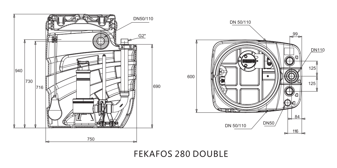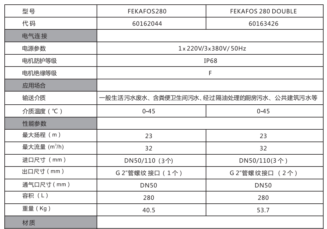 FEKA FOS污水提升泵站按照箱体有效容积为280L,分单泵和双泵两类,可配套一台或两台水泵(无阻塞 涡流泵和切割泵),两台污水泵,一用一备,互为备用,高水位时同时启动;夕卜置控制器配报警浮球,故障时 报警并实时监测设备运行情况;箱体为聚丙烯环保可回收材料,轻便安装运输便捷,防腐性能好,使用寿命长, 能有效预处理污水及防止异味;预留多个标准进水口,1个通气口和1个紧急排空口,水泵采用耦合式安装,方 便客户根据现场条件安装选择和维修;内置潜水电机冷却效果好,S1连续运行模式;优化产品设计,高强度箱 体和检修盖,人性化的手提空设计,尽力满足客户个性化要求。原装意大利进口,产品满足欧盟EN12050-1/2 标准,通过欧洲LGA]责量认证。
