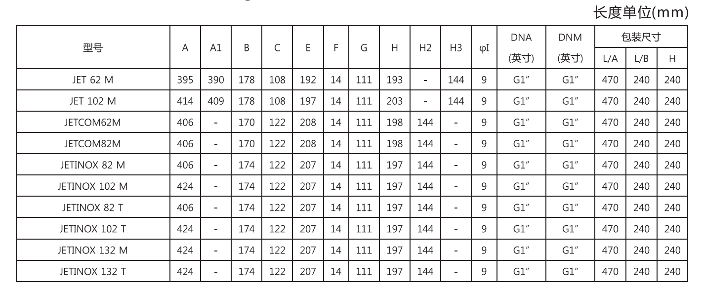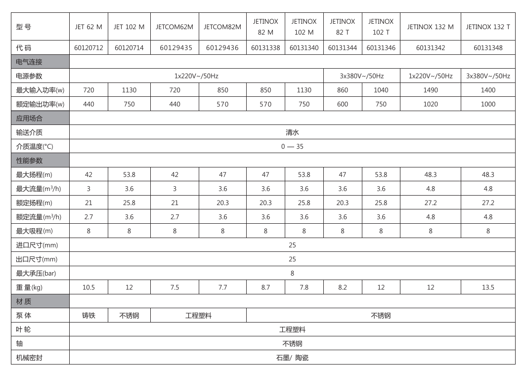 自吸剥ET/JETCOM/JETINO烬列设计美观紧凑,采用文丘里管结构,自吸性能好;在介质中含有少量气海和 细小婀的情况下,仍有很强的自吸能力;感应电机,风扇自冷,可靠性和效率高,噪音低;叶轮材质为高聚合物工 程塑料,耐腐蚀,强度高,24月保修期。