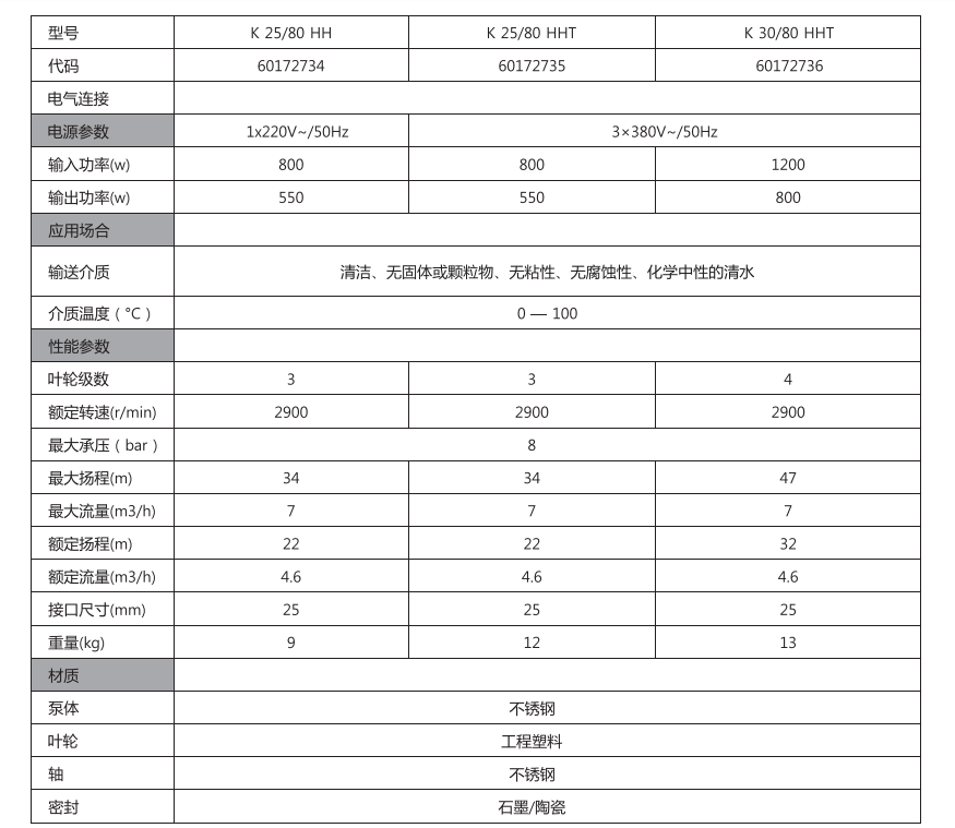 AISI30环锈钢泵体、端盖及转子轴,外观觐,使用 寿命长;接线盒防护等翎P55,电机防护等翎P44,绝缘等 级F;带有埋入式麟护器和启动电容,运行噪音低;多级 叶轮,高扬程,24月保修。