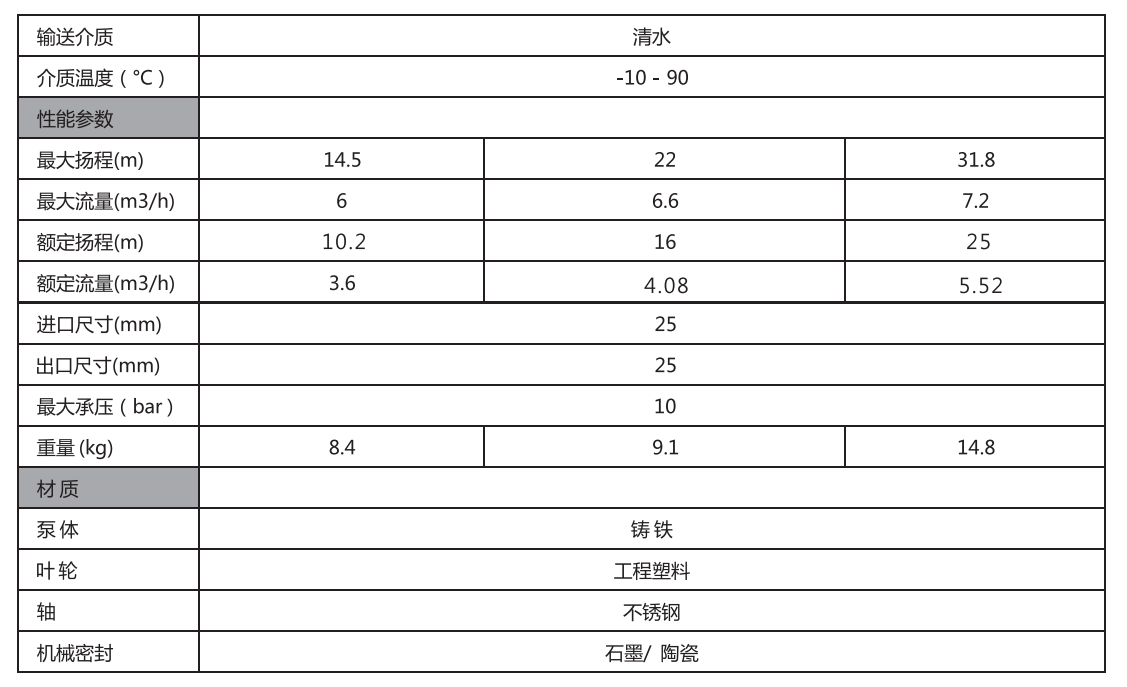 电机符合CEI2-3标准、CCC标准,高效节能;自润滑密封轴承,确保电机静音运行,有效延长寿命;埋入式醐 护器在电机过热时停止运行,有效保护电机;高聚合叶轮,精度高、确保运行剛性和安全性;泵体经电泳处理,不 易生锈,耐腐蚀,24个月质保期,