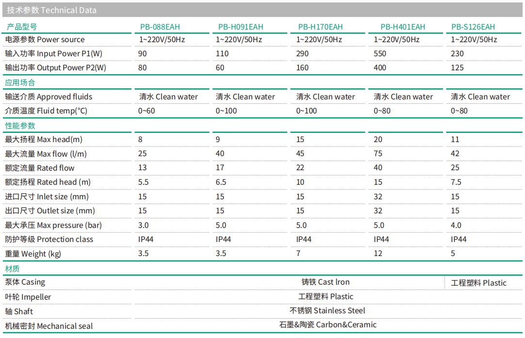 泵体:铸铁;叶轮:工程塑料;轴:不锈钢;机械密封:石墨&陶瓷